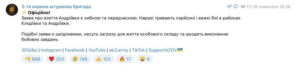 Через 40 минут 3-я отдельная штурмовая бригада ВСУ, которая воюет сейчас под Бахмутом, опровергла заявление замминистра.
