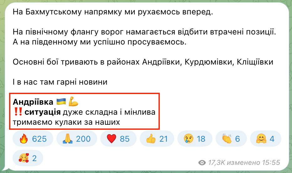 Добавим, что российские военкоры в последние дни писали, что в районе Клещеевки и Андреевки ВС РФ подтянули резервы и контратакуют, пытаясь выбить ВСУ.