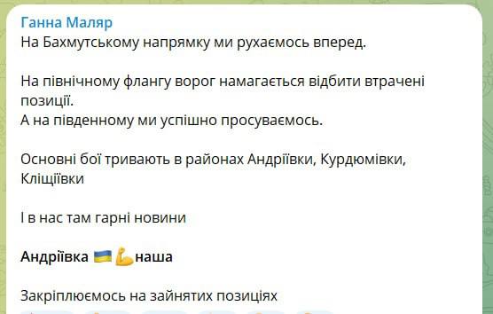 Замминистра обороны Незалежной Анна Маляр поспешила отрапортовать о взятии села Андреевка, расположенного возле Клещеевки к югу от Бахмута. Вблизи Клещеевки бои идут уже несколько месяцев, а успеха, даже локального, ВСУ так и не достигли. Устав оправдываться за людские потери и уничтожение техники, украинские чиновники не упускают возможности браво объявить о продвижении вперёд даже на несколько сантиметров.
