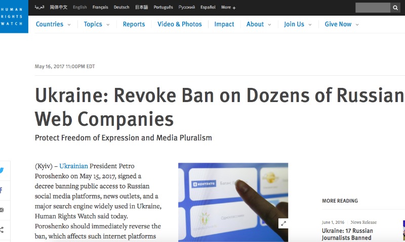 Президент Украины Петр Порошенко должен немедленно отменить свой указ о блокировке российских сайтов и предпринять шаги по защите свободы слова и информации в стране. С таким заявлением выступила накануне, 16 мая, известная правозащитная организация Human Rights Watch.