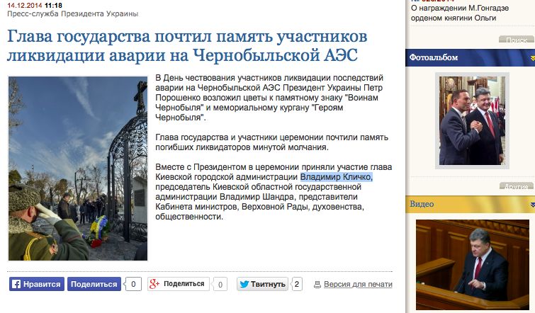 На сайте главы государства появилась заметка, что Порошенко почтил память участников ликвидации аварии на Чернобыльской АЭС. Он возложил цветы к памятным местам. Вместе с Порошенко в мероприятии поучаствовали киевские чиновники, в том числе и Глава киевской городской государственной администрации Виталий Кличко.