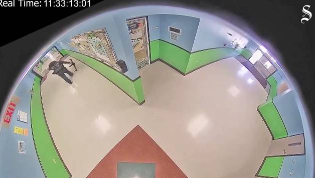 На кадрах видно, как преступник проходит по коридору, начинает стрелять и заходит в класс. Через три минуты в коридор прибегают несколько полицейских. Трое из них подходят к классу, но услышав звуки выстрелов, убегают. Штурм не начался и после того, как спустя более 40 минут ожидания из класса послышались четыре выстрела — силовики подошли к двери, но не ворвались внутрь.