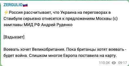 Блогер Сергей Колясников (Zergulio) пишет, что Россия все же рассчитывает на серьезное отношение Украины к предложениям Москвы на переговорах в Стамбуле. При этом журналист ссылается на заместителя главы МИД РФ Андрея Руденко, не забыв обратить внимание на деталь: при заявлении этого дипломат вздыхает.
