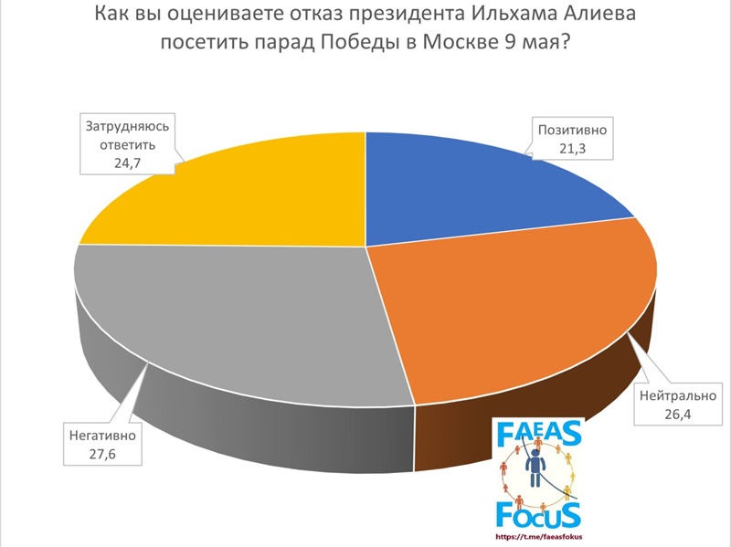 Социологическое объединение «ФОКУС» провело опрос азербайджанцев и получило следующие результаты: лишь 21% считает, что Алиев все сделал правильно. Осуждают его решение 28%. На долю отнесшихся нейтрально и тех, кто затруднился с ответом, пришелся оставшийся 51%.