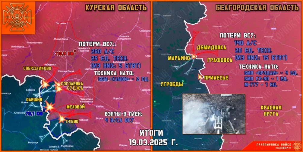 Телеграм-канал «Северный ветер» сообщает, что основные столкновения развернулись в районах населённых пунктов Гуево и Меловое, а также на подступах к Суджанскому приграничью.