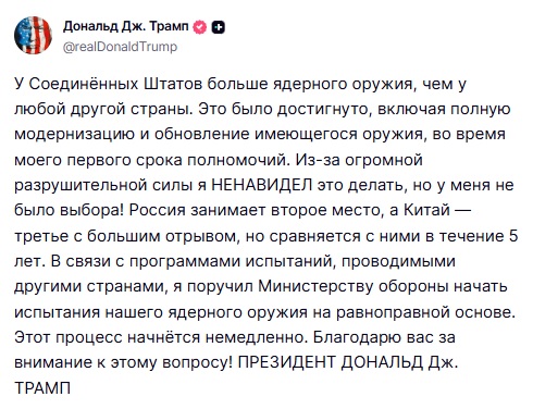 Напомним, незадолго до поездки в Пусан Трамп поручил Пентагону немедленно начать испытания ядерного оружия, мотивировав это тем, что другие страны, включая Китай и Россию, уже проводят аналогичные программы. По оценке американского лидера, Китай может догнать США в области ядерных технологий в течение пяти лет.