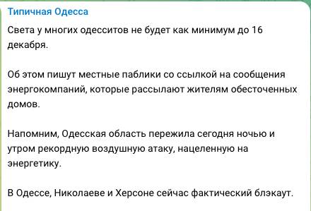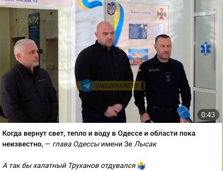 Большинство украинских СМИ написало о том, что назначенный Владимиром Зеленским «гауляйтер» - глава Одесской городской военной администрации Сергей Лысак сообщил о прилетах по объектам энергетической, транспортной и промышленной инфраструктуры. Бригадный генерал из Днепропетровской области заявил, что ни воды, ни света не будет до 16 декабря. Также в мэрии сообщили, что в Одессе сегодня с утра не работает весь электротранспорт.