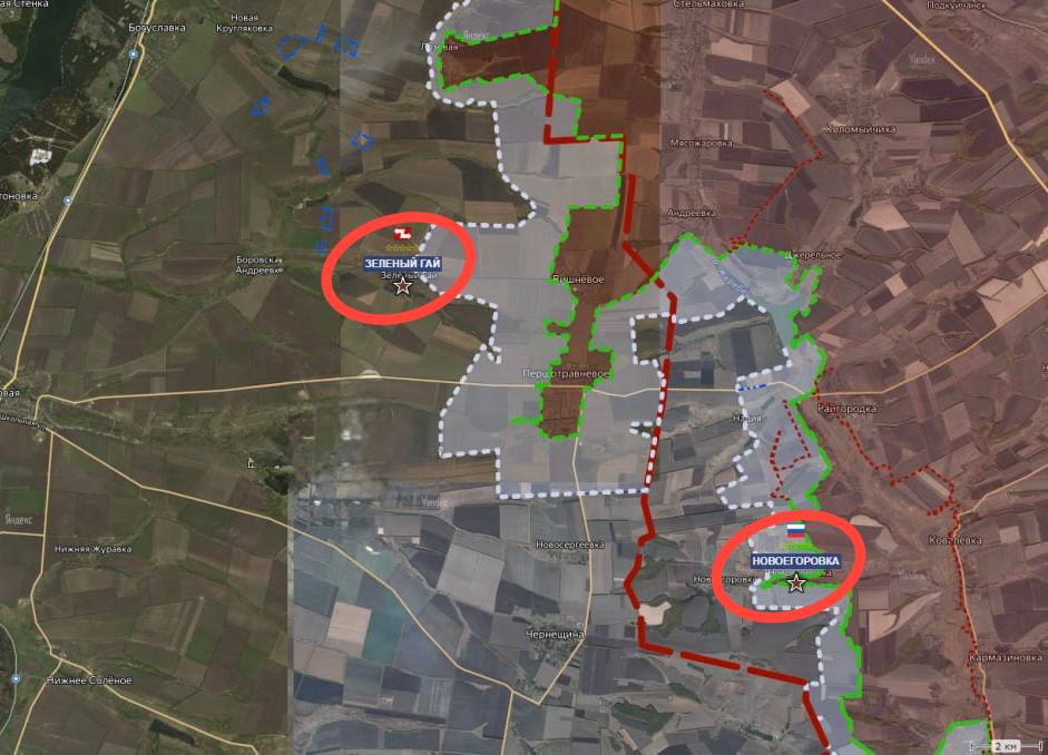 Буквально вчера была почти освобождена деревня Новоегоровка, а сегодня сообщается о том, что наши войска зашли в Зеленый Гай и зачистили его от националистов. Бои за поселок не останавливались аж с ноября прошлого года. Сейчас же он находится под нашим контролем. Отсюда мы давим врага и двигается к линии Богуславка – Боровая, что вдоль реки Оскол.