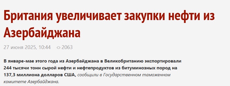 В конце июня появились данные о резком увеличении британских закупок азербайджанской нефти - за первые пять месяцев 2024 года экспорт составил 244 тысячи тонн на сумму 137,3 миллиона долларов. Эта экономическая привязка объясняет заинтересованность Лондона в эскалации антироссийских настроений в Баку.