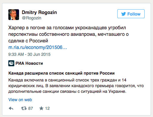 «Харпер в погоне за голосами укроканадцев угробил перспективы собственного авиапрома, мечтавшего о сделке с Россией», - написал Рогозин в Twitter со ссылкой на материал о санкциях на РИА Новости.