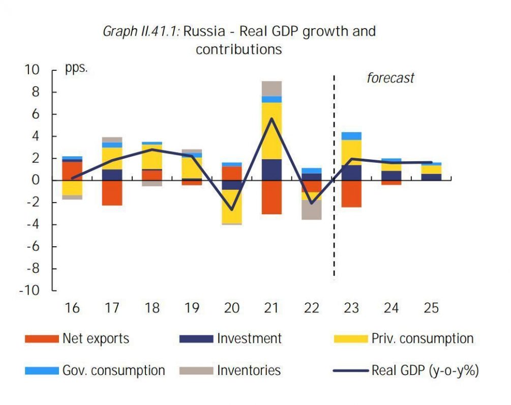 Еврокомиссия пересмотрела свой прогноз динамики российского ВВП по итогам 2023 года. Если раньше ожидалось падение на 0,9%, то теперь прогнозируется рост на 2%. В 2024 и 2025 годах прогнозируется рост в 1,6% ежегодно.