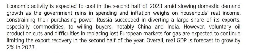 «России удалось перенаправить большую часть своего экспорта, особенно сырьевые товары, в Китай, Индию и другие страны. Однако добровольное сокращение добычи нефти и трудности с заменой утраченных европейских рынков газа будут ограничивать восстановление экспорта во второй половине года. В целом реальный ВВП страны, по прогнозам, вырастет на 2% в 2023 году», — говорится в документе.