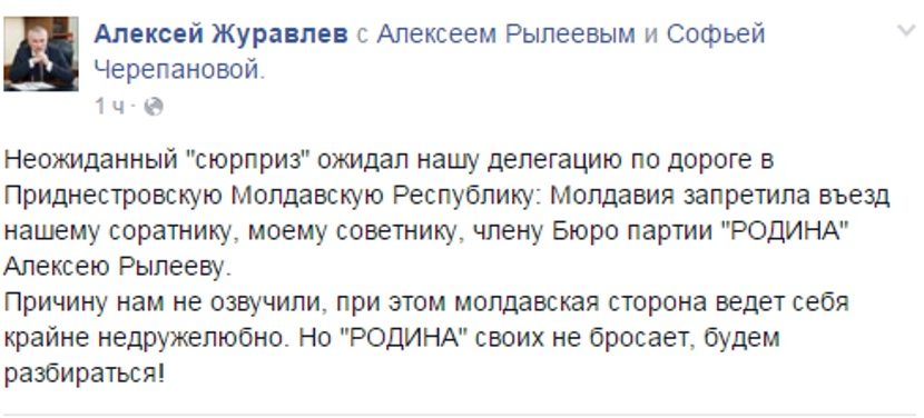 «Неожиданный «сюрприз» ожидал нашу делегацию по дороге в Приднестровскую Молдавскую Республику: Молдавия запретила въезд нашему соратнику, моему советнику, члену Бюро партии «Родина» Алексею Рылееву. Причину нам не озвучили, при этом молдавская сторона ведет себя крайне недружелюбно. Но «Родина» своих не бросает, будем разбираться!» - написал Журавлев на своей странице в соцсети. В настоящее время российский депутат находится в Кишиневе и пытается прояснить ситуацию.