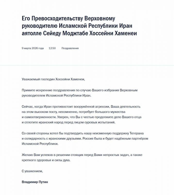Президент России Владимир Путин поздравил Моджтабу Хаменеи с избранием новым верховным лидером Ирана. Телеграмма опубликована на сайте Кремля 9 марта и стала важным сигналом на фоне стремительного обострения ситуации на Ближнем Востоке.