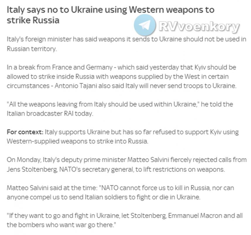 «Мы не отправим ни одного итальянского солдата воевать на Украину и не хотим, чтобы отправляемые военные средства использовались за пределами украинских границ. Все оружие, которое идет из Италии, должно быть использовано на Украине», - заявил глава МИД Таяни.