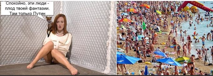 Именно с этого сайта блоггеры черпали идеи для создания смешных картинок про Джен Псаки. Самой популярной на запрещенном ресурсе была фотожаба, на которой Псаки сидела в одном белье, забившись в угол, а «упоротый лис» шептал ей, что вокруг нее не люди на пляже, а только российский президент Владимир Путин.