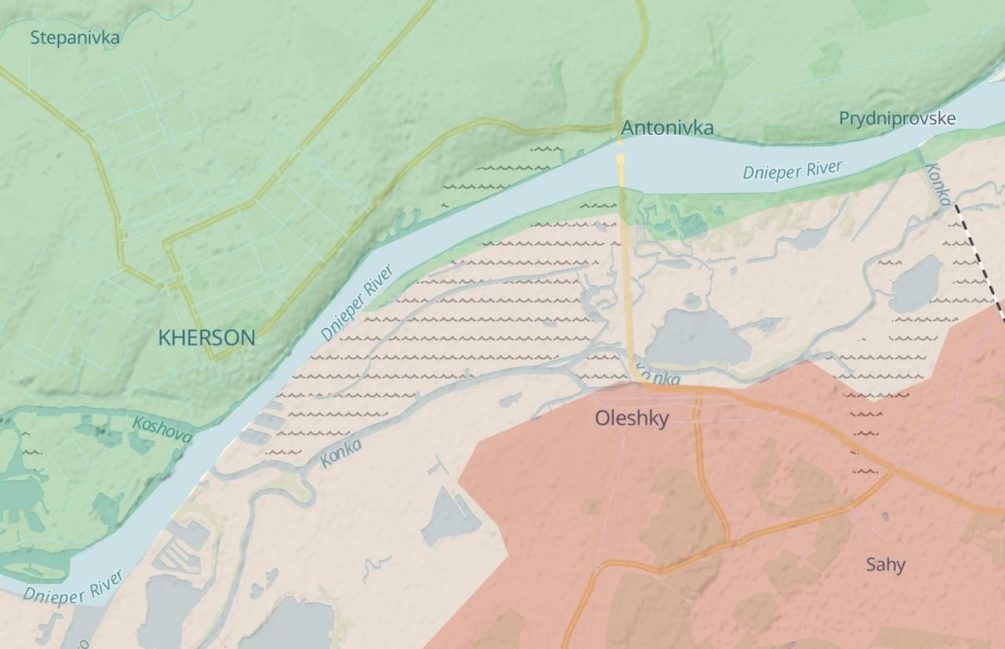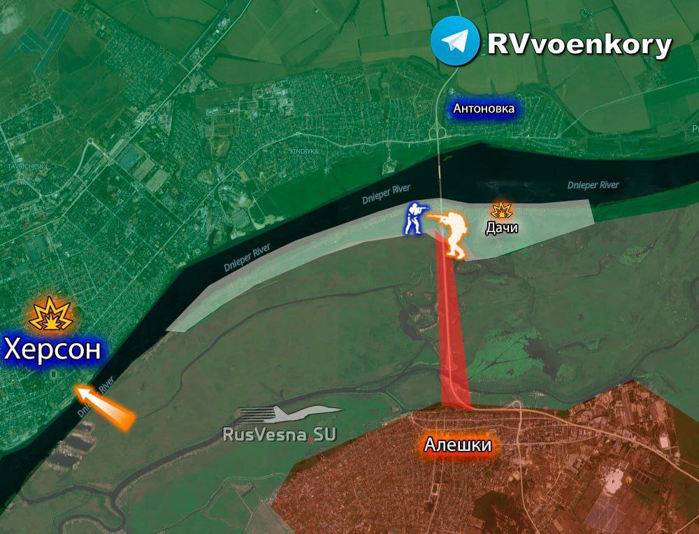На данный момент поступают сведения о том, что российская армия смогла прорваться и закрепиться на дачах вблизи Антоновского моста под Херсоном. Продвижение российских подразделений обеспечивало прикрытие беспрецедентного артиллерийского обстрела по украинским позициям. Обстрелы достигали интенсивности до 1000 снарядов за 40 минут, сообщают украинские источники. В это время, по данным украинской стороны, российские ДРГ несколько раз пытались войти в город со стороны Антоновского моста.