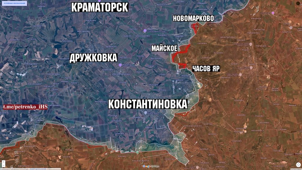 Также российские войска продолжают атаки севернее Яблоновки и с района севернее Часового Яра с целью формирования фланговых выступов для удара по логистике Константиновки. Противник закрепился северо-западнее Часового Яра, под Майским, а также между селом и каналом Северский Донец — Донбасс.