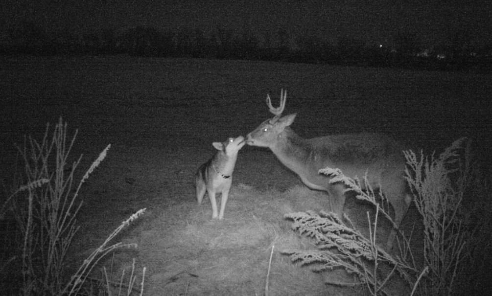 Позже она решила проверить камеры наблюдения, установленные ее соседкой в лесу. Результат оказался ошеломляющим: Кода проводила время в компании оленя. Он совсем не пугается собаки — напротив, они мирно гуляют вместе, лежат, смотрят вдаль и даже соприкасаются носами.
