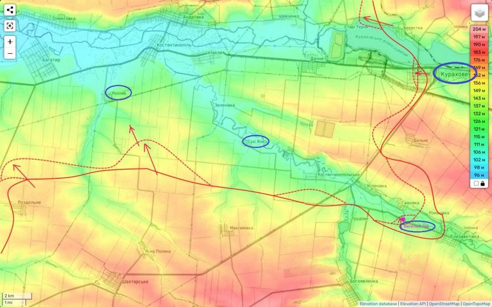 Вчера активные столкновения происходили в районе населенного пункта Весёлый Гай. Кроме того, в самом Курахово наши войска продолжают выдавливать противника из высотной застройки города, которая на утро была разделена примерно поровну. Также продолжаются бои в районе реки Сухие Ялы, где наши силы пытаются укрепить свои позиции.