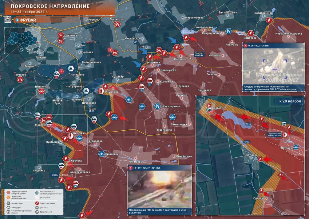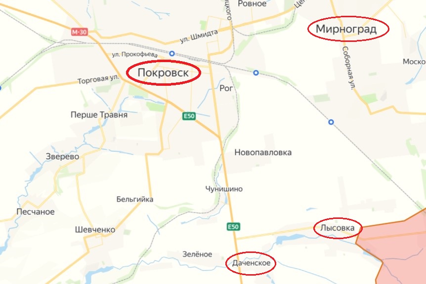 На западе российские войска добились значительных успехов в Лысовке, достигнув южного берега водоема. Освобождение Новогродовки сделало этот населенный пункт стратегически важным узлом обороны для украинских сил, расположенных к югу от Мирнограда. В настоящее время неясно, смогли ли российские штурмовики захватить северную часть села, где сосредоточена более плотная застройка. Продвижение на южном фланге откроет нашим войскам путь к восточным окраинам Даченского, что создаст серьезную угрозу окружения для украинских сил, находящихся в кармане между Лысовкой и Петровкой.