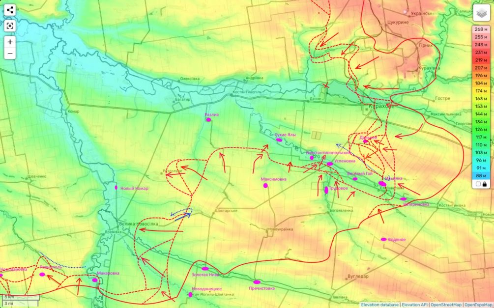 Далее вероятен удар на Новый Комар, после чего группировка ВСУ в Большой Новоселки окажется в оперативном окружении. Тем временем, другие наши подразделения продвинулись из района Новодонецкого на четыре километра, а от Шахтерского аж на пять, выйдя к окрестностям Большой Новоселки.