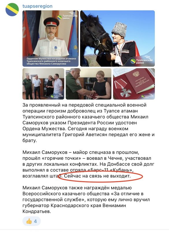 В Telegram-канале администрации Туапсинского района (Краснодарский край) цинично сообщается, что якобы «Саморуков не вышел на связь», поэтому награду передали семье героя — жене и брату.