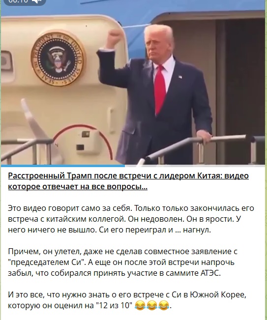 Подоляка отметил, что Трамп выглядел явно расстроенным и уехал без какого-либо совместного заявления с Си Цзиньпином — что само по себе свидетельствует о провале переговоров. По мнению блогера, китайский лидер сумел переиграть американского президента, оставив того «ни с чем».