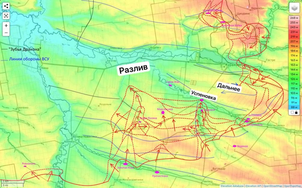 На этом же направлении штурмовики достигли успеха в окрестностях Успеновки. Враг выбит из серьезного опорника западнее реки Сухие Ялы. Правый ее берег реки сильно укреплен ВСУ и наши ВКС и арта сейчас методично разбивает укрепы врага. Далее на пути ВС РФ собственно сама Успеновка, после которой подразделения смогут выти к населенному пункту Дальнее, в окрестностях которого уже работают их коллеги которые берут в полукольцо Курахово. После этого часть группировки противника окажется в небольшом котле.