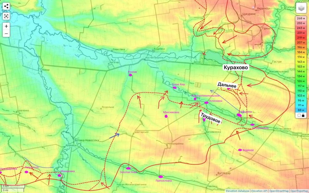 Наши ребята достигли определенных успехов в населенном пункте Дальнее, но по-прежнему не могут целиком перерезать дорогу между Успеновкой и Курахово. По мнению аналитика Подоляки, всё происходящее здесь напоминает последние дни обороны Угледара, когда враг выходил из города с чудовищными потерями.