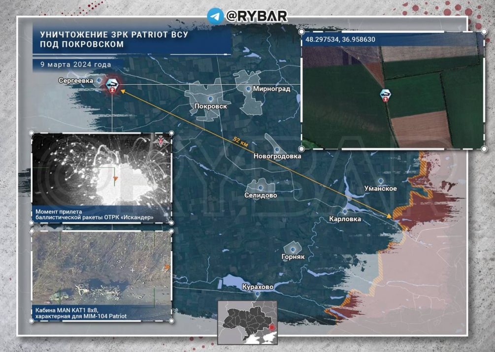 Накануне вечером разведывательным БПЛА в окрестностях Покровска (Красноармейска) выявлен район размещения техники ПВО MIM-104 Patriot. Около 20:30 совершена комбинированная атака по цели.