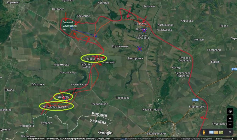 Пытаясь ответить на наши действия Киев подтянул дополнительные резервы и провел четыре контратаки, общая численность которых составила до 40 человек. Эти атаки были поддержаны западной бронетехникой и были направлены на населённые пункты Дарьино и Николаево-Дарьино. Однако ни одна из контратак не увенчалась успехом. Потери противника в результате этих столкновений составили до 20 человек личного состава и один танк.