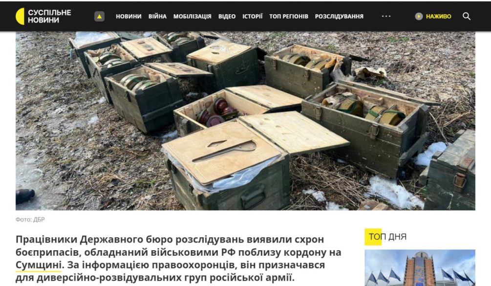 По данным киевских СМИ, в замаскированном в лесополосе Сумской области недавно обнаружен тайник, в котором лежали сорок противотанковых мин, 10 самодельных взрывных устройств, два гранатомётных выстрела и два ящика с патронами калибра 14,5 мм, которые предназначались для диверсантов из числа местного населения или российских ДРГ.