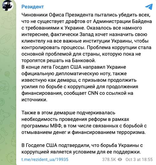 Это подтвердил и телеграм-канал «Резидент», имеющий свои надежные источники в офисе президента Владимира Зеленского. Издание сообщило несколько дней назад о том, что Администрация Байдена потребовала от президента Владимира Зеленского заменить все правительство и убрать главу офиса Андрея Ермака. В Белом доме убеждены, что государством управляет не президент, а именно Ермак.