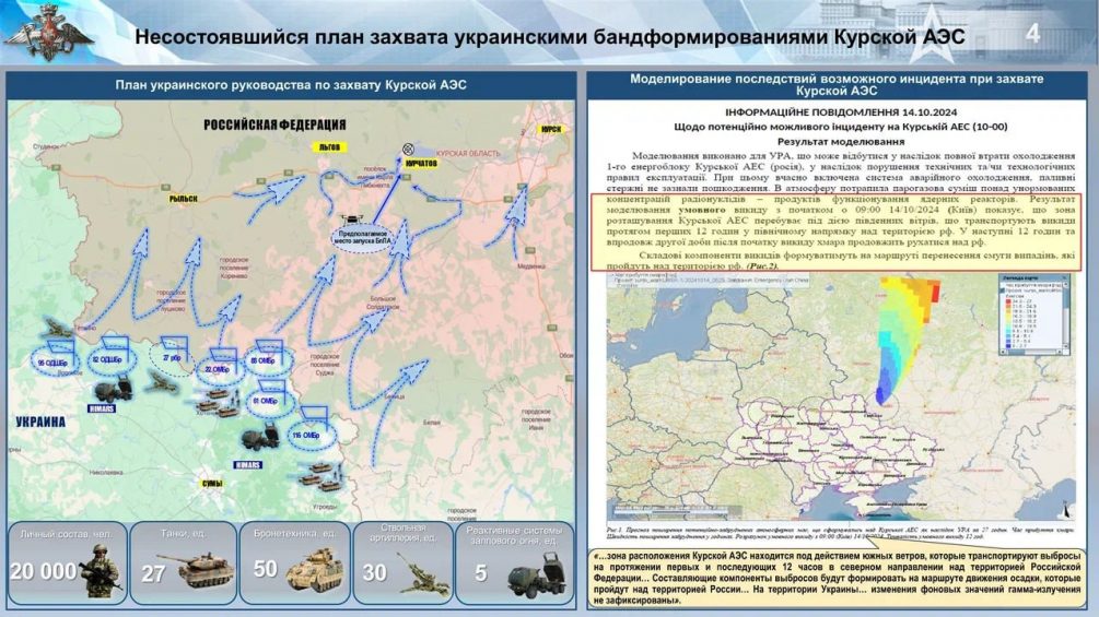 Кириллов также уточнил, что российская сторона получила доступ к внутреннему докладу Государственной службы по чрезвычайным ситуациям Украины, на основе которого планировалась операция. В документе говорится, что при аварии на Курской АЭС, в случае реализации этого сценария, радиоактивное загрязнение в первую очередь угрожало бы территории России.
