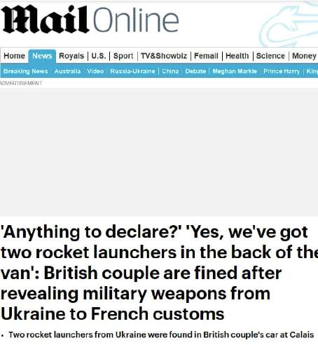 Во Франции задержали двух супругов из Великобритании, которые возвращались домой после того, как поработали на Украине волонтерами. Французские таможенники обнаружили у британцев два американских гранатомета М141, которые они пытались провести домой в багажнике своего автомобиля.