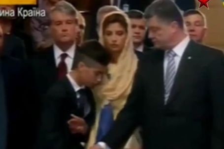 Экс-президент Украины Виктор Ющенко подхватил сына нынешнего главы Петра Поршенко - 13-летнего Мишу, когда тот упал в обморок во время молебна за благополучие Украины.