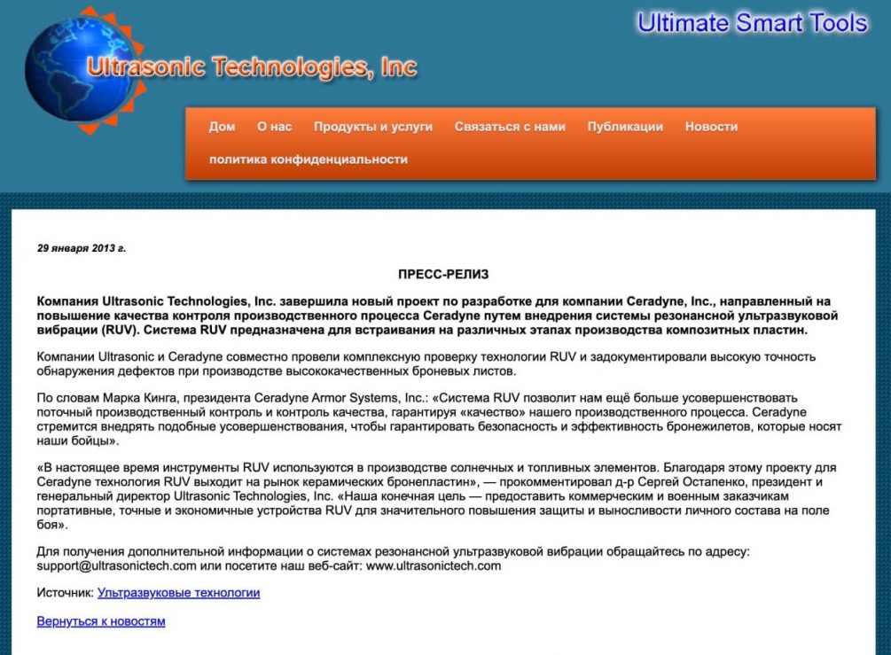 В 2013 году его фирма завершила важный проект для Ceradyne Inc (подразделение 3M Company), разработав технологию RUV - резонансную ультразвуковую вибрацию для контроля качества бронежилетов.