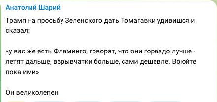 Как пошутил оппозиционный журналист Анатолий Шарий, Трампа удивила просьба Зеленского о «Томагавках». «У вас же есть «Фламинго», говорят, что они гораздо лучше – летят дальше, взрывчатки больше, сами дешевле. Воюйте пока ими». Он великолепен», - написал блогер в телеграм-канале.