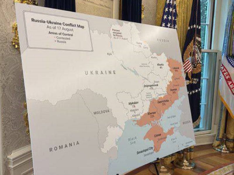 В Овальном кабинете Белого дома переговоры Дональда Трампа с Владимиром Зеленским начались с символичного «сюрприза». Прямо напротив знаменитого стола «Резолют» висела огромная карта Украины. Восточная часть страны была закрашена в розовый цвет — именно так были отмечены территории, контролируемые российскими войсками. По сути, эта карта стала наглядным напоминанием: почти пятая часть государства уже утрачена.