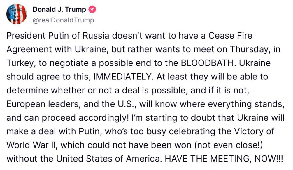 «Власти Украины должны немедленно согласиться на предложение президента России Владимира Путина о проведении в Стамбуле переговоров по урегулированию конфликта», - написал американский лидер Дональд Трамп в социальной сети Truth Social, не упоминая никакой предварительной остановки огня.