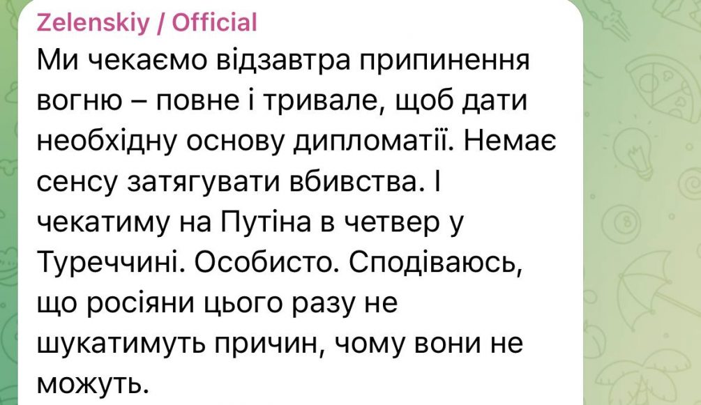 «Полного и длительного, чтобы дать необходимую основу дипломатии. И буду ждать Путина в четверг в Турции. Лично. Надеюсь, что россияне на этот раз не будут искать причин, почему они не могут», - написали в Киеве.
