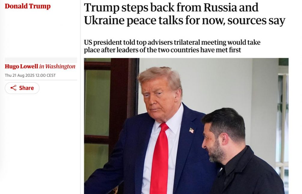 Трамп решил отступить от мирных переговоров между Путиным и Зеленским, — пишет The Guardian. Он хочет, чтобы Украина и Россия самостоятельно организовали двустороннюю встречу. Трамп планирует занять «выжидательную позицию», чтобы посмотреть, возможно ли проведение подобной встречи. На этом фоне Зеленский сразу распоясался и вернулся к своим ранее отвергнутым требованиям: прекращение огня перед встречей, отказ от признания территорий за РФ и прав русского языка на Украине. А заодно грубо отверг инициативу Китая об его участии в обеспечении безопасности после заключения мира: только страны НАТО. На этом фоне перспективы встречи Путина и Зеленского начали стремиться к нулю.
