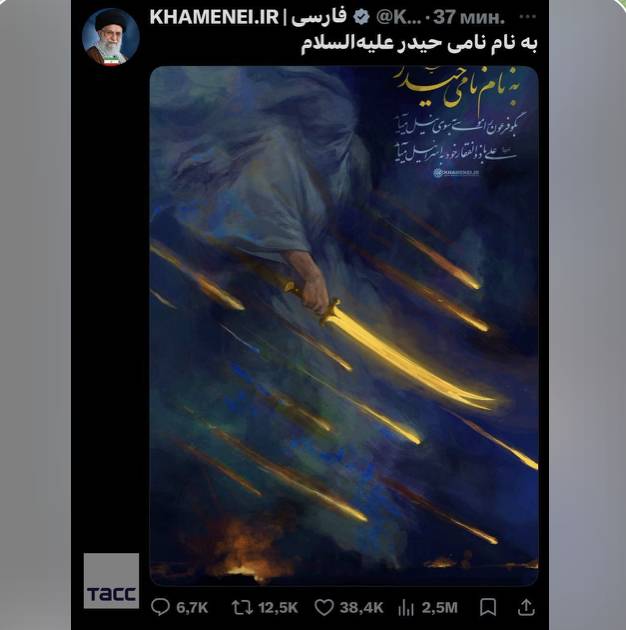 Ибрагимов обратил внимание на то, что на странице в соцсети Х убитого верховного лидера Ирана Али Хаменеи появилась первая с начала конфликта с США запись. На персидском языке появилась фраза «Во имя Али». Она размещена под изображением огненного (пылающего) меча пророка Мухаммеда. Как пояснил эксперт, фраза «во имя Али» может носить двойной смысл. У шиитов Али – первый имам и духовный наследник пророка Мухаммеда, однако в текущей ситуации фраза «во имя Али» может приобретать и дополнительный символический оттенок, отсылая к действующему верховному лидеру, чьё имя также Али.