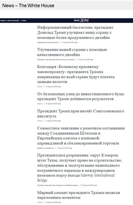 Шоу вместо ожидаемого «экстренного заявления» получил мир 22 августа. Анонс Белого Дома был таким, что все приготовились узнать нечто грандиозное: например, о найденном компромиссе по конфликту России и Украины. Вместо этого журналисты узнали, что Трамп остановил уже не шесть, и даже не семь войн, а – десять. А еще он похвастал совместным фото с Путиным. Впрочем, пустое бахвальство стало для Белого Дома уже нормой: если почитать его сайт, то он превратился в сплошное славословие Дональда Трампа, напоминая муниципальную районку из российской глубинки.