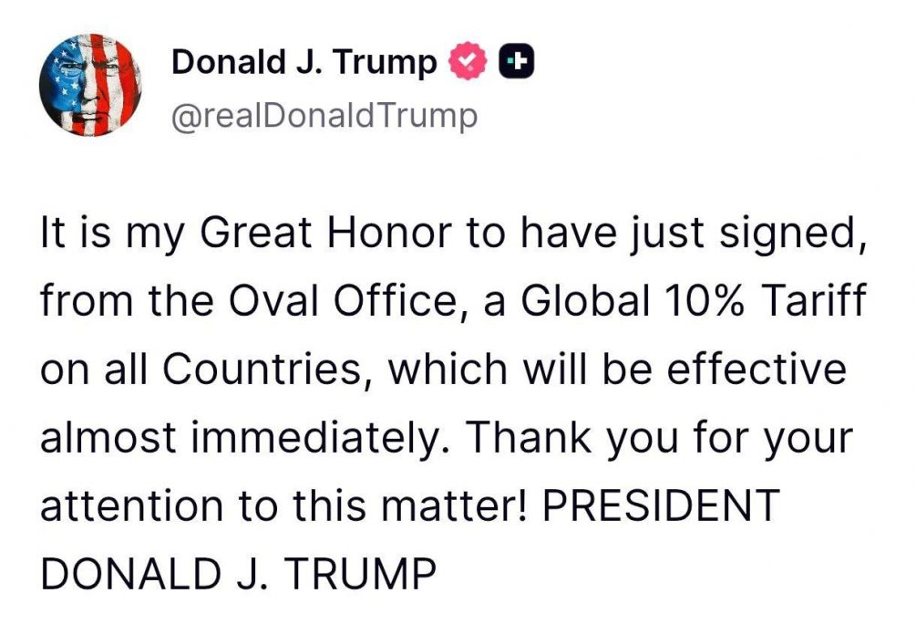 Действительно, он сразу после решения суда, сообщил, что вместо отмененных Верховным судом тарифов ввел новый всеобщий планетарный тариф размером 10%. Мера вводится сроком на 150 дней и вступит в силу 24 февраля в 00:01 по восточному времени.