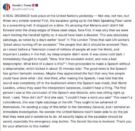 Американский президент, который с завидной регулярностью делится своими мыслями в соцсетях, оставил по этому поводу эмоциональный пост. В нем Трамп назвал произошедшее «настоящим позором» и потребовал от Генерального секретаря ООН немедленного расследования с арестами саботажников, то есть тех, кто отключил эскалатор, телесуфлер и аудиосистемы.