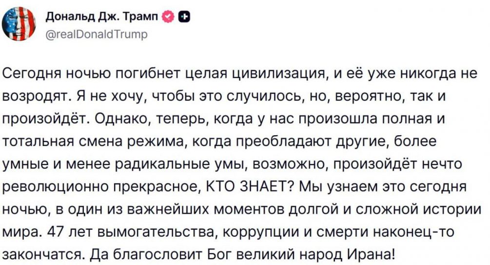 Заявления Дональда Трампа становятся всё жёстче — и всё тревожнее. В своей соцсети он предупредил, что «сегодня может погибнуть целая цивилизация», добавив, что не хотел бы такого исхода, но считает его вполне вероятным. При этом он вновь намекнул на возможность смены режима в Иране, назвав последние десятилетия в стране «эпохой вымогательства, коррупции и смерти».