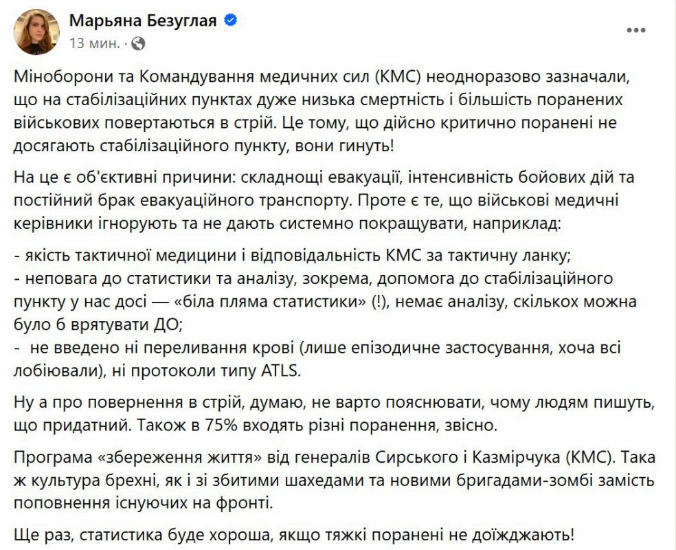 Она утверждает, что никто не анализирует, сколько человек медики могли бы спасти, если бы процесс был налажен. Она напрямую обвинила главкома армии Сырского в массовой гибели раненых бойцов ВСУ.