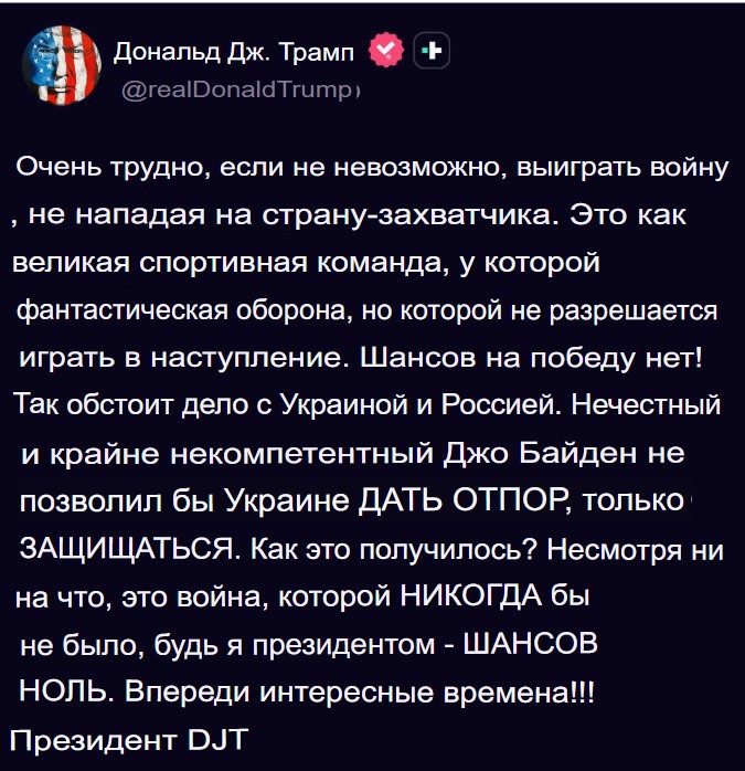 «Так обстоит дело с Украиной и Россией. Нечестный и крайне некомпетентный Джо Байден не позволил Украине дать ОТПОР, а только ЗАЩИЩАТЬСЯ. Впереди интересные времена!!!»